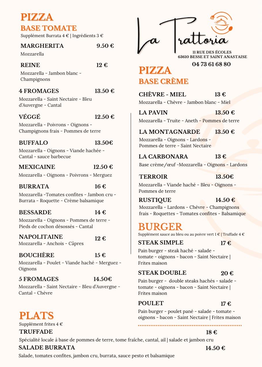 Toute l'équipe de LA TRATTORIA vous souhaite la bienvenue à BESSE ET SAINT ANASTAISE !